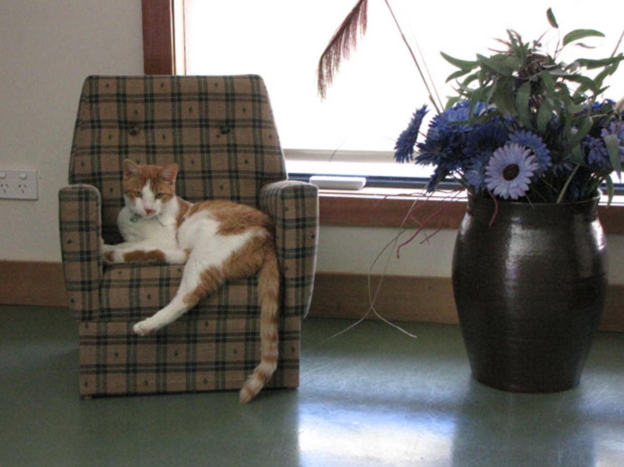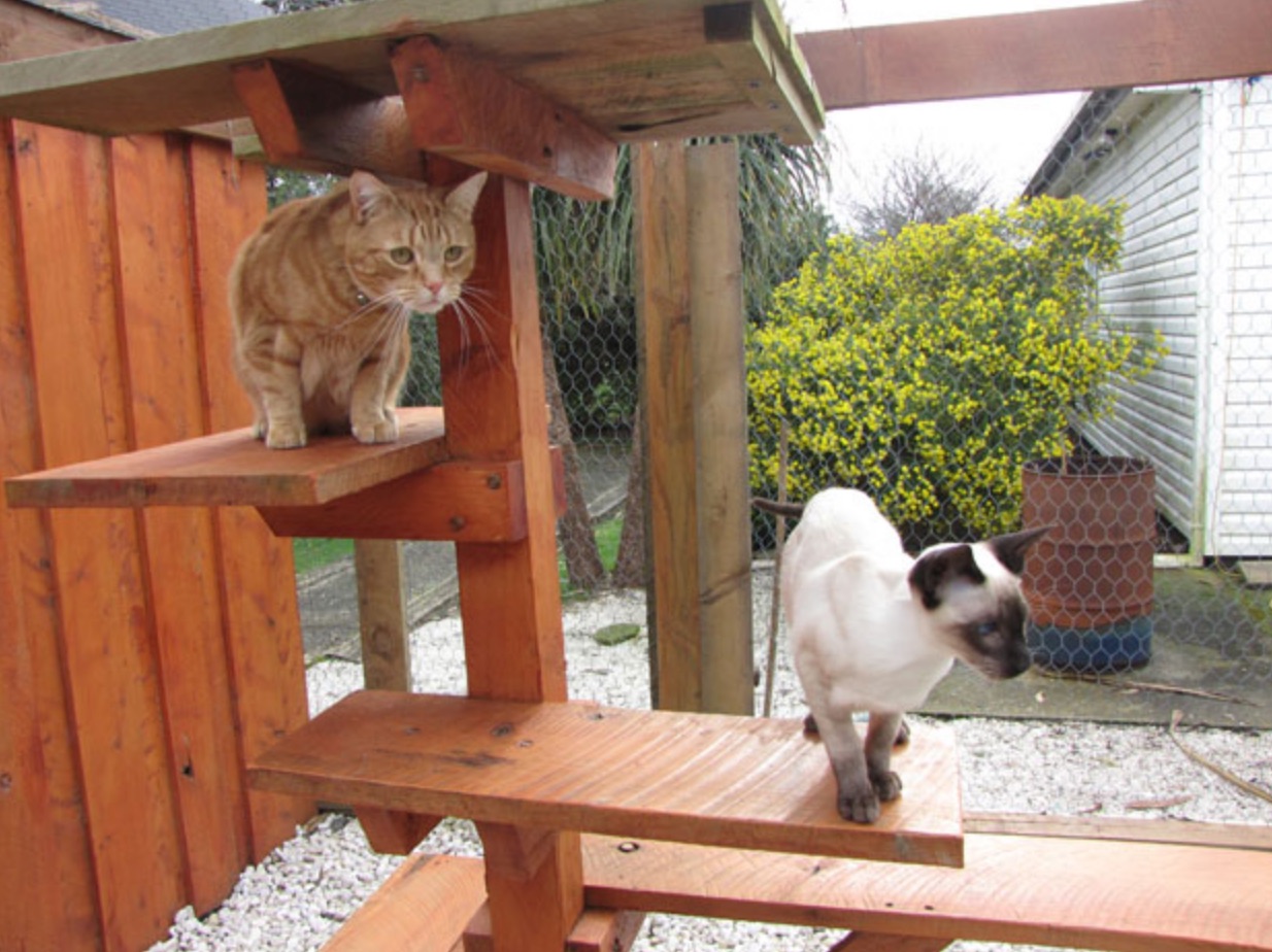 Standard pens are fully carpeted and these cats have a communal outside play area where they can climb, run or sit and watch the fish swimming in the pond.